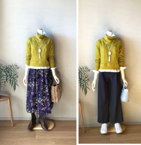 白いシャツ+オリーブ色のタートル+赤のタートル